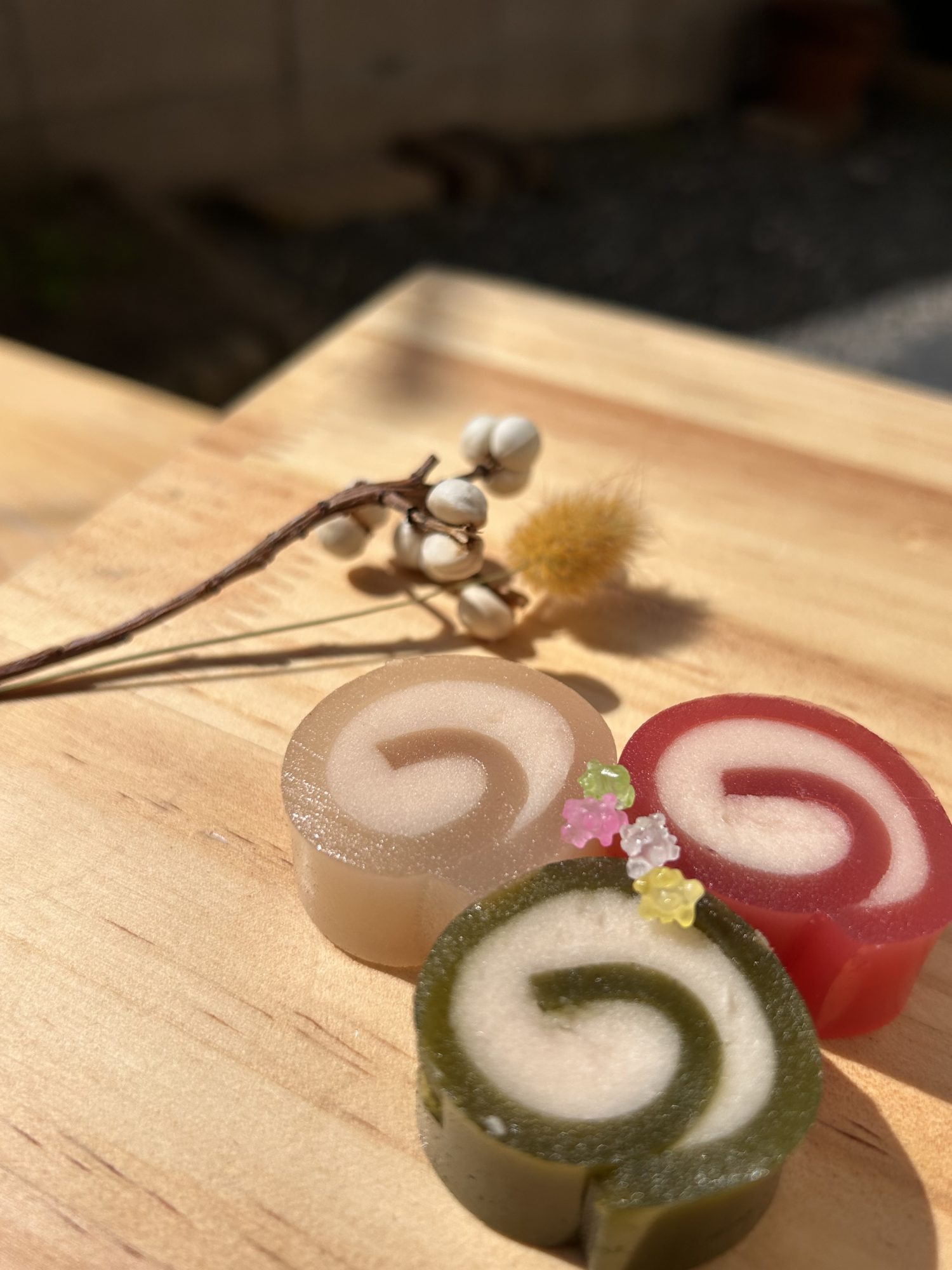 去年の花見よりもさらに華やかに、そして春を感じる源氏巻となっています。 ピンクはうっすらビーツで色付け、緑は抹茶味、白は色付け前のシンプル羊羹です。